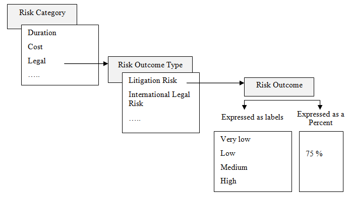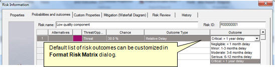 Outcome types can be a label (e.g. Critical > 1 year delay) or a percentage (e.g. 5%), or a combination of both. You may set how you want to enter and view risk outcomes in the Format Risk Matrix dialog box. Each label is associated with percentage, which is the midpoint of the interval for each label: