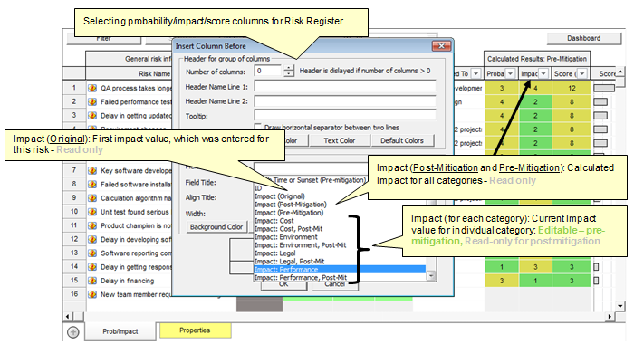 You can define risk properties as columns in Risk Register view. To do it, click on the header in Risk Register and insert column with risk property Defining risk chances and outcomes in the Risk Register gridBy default, the Risk Register’s columns don’t allow you to enter risk chance and outcome directly. You need to define appropriate columns first: