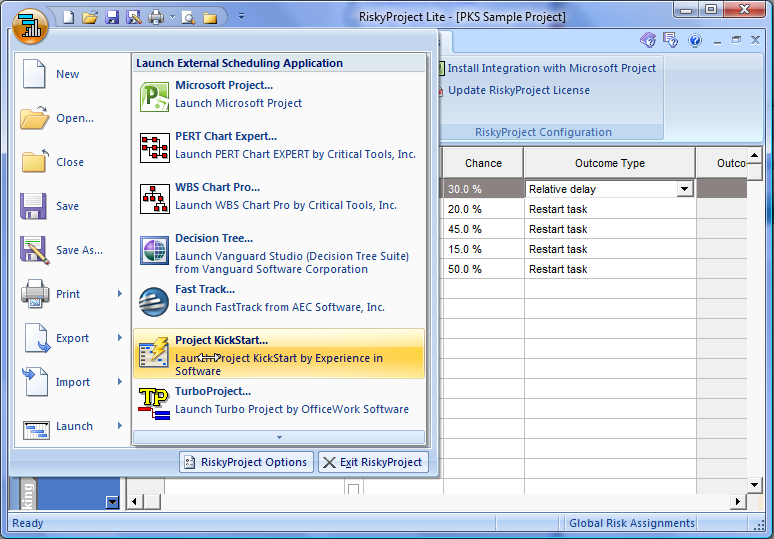 - The Results of your probabilistic analysis can be presented in the Result Gantt view of RiskyProject. The resulting project schedule can be exported back to Project KickStart. Project KickStart can be launched directly from RiskyProject. Just click on Tools>Scheduling Software>Project KickStart.