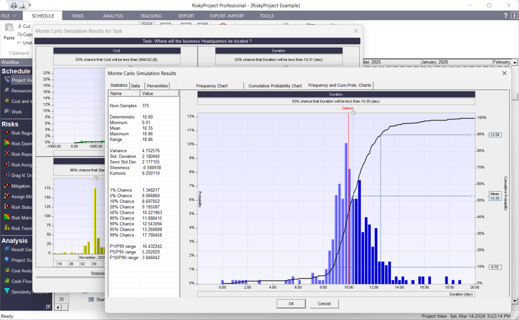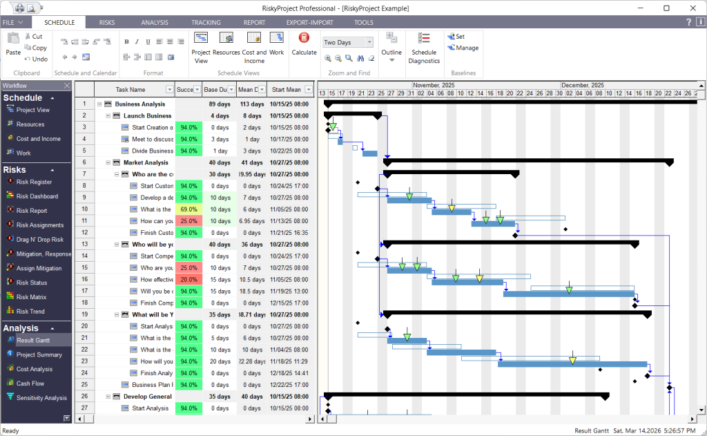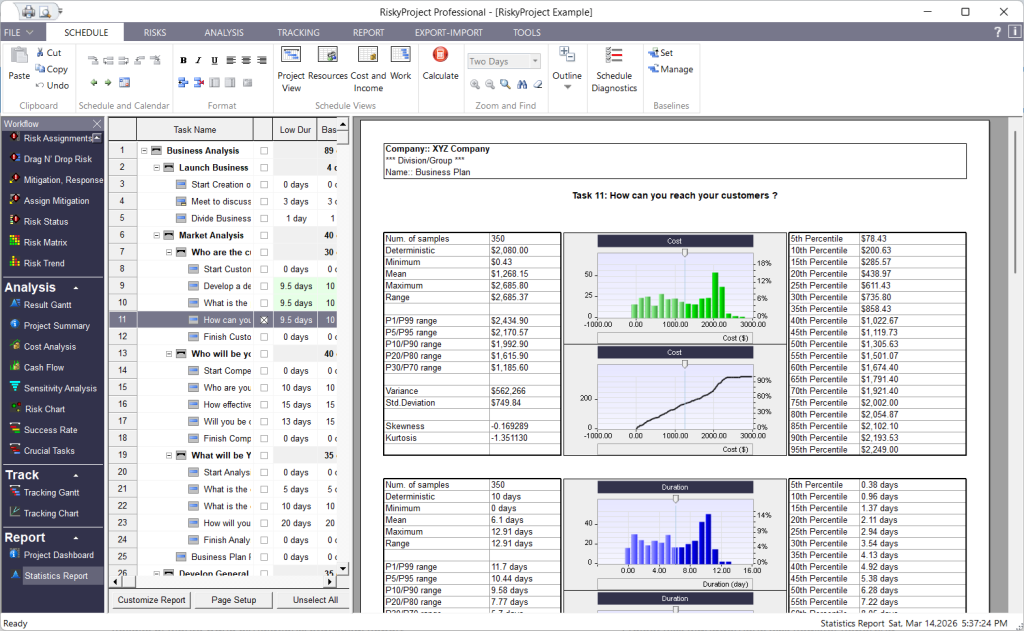 Project risk analysis is a process of defining and analyzing threats and opportunities affecting project schedules. Project risk analysis helps to determine how uncertainties in project task and resources affect project scope, deliverables, cost, duration, and other parameters. Project risk analysis also helps to ranks project tasks and resources based on their risk exposure, calculate overall project risk exposure, and determine efficiency of risk mitigation and response efforts. RiskyProject supports both quantitative and qualitative risk analysis and management. Cost and schedule risk analysis can be integrated and is performed using a high performance Monte Carlo simulation engine.