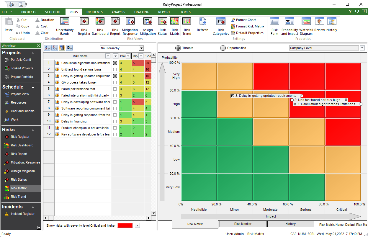 RiskyProject Enterprise is a portfolio risk management software. RiskyProject Professional features advanced risk analysis functionalities: project planning, scheduling, quantitative risk analysis, and project performance measurement. RiskyProject Lite has the same project scheduling and performance measurement functionalities, but it includes only basic quantitative risk analysis functionalities.