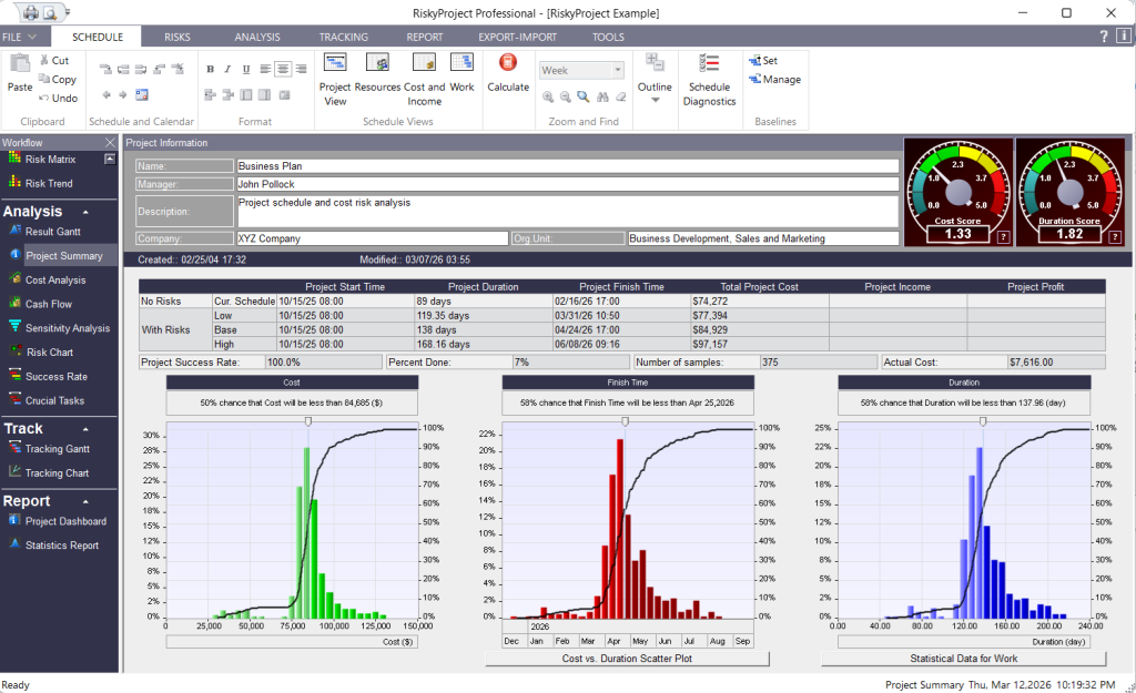 Interactive charts are also provided, which allow you to determine the chance the project will be completed on certain date, will have a certain duration, and will have a certain final cost. The project Summary also provides the overall project success rate, or chance that project will be not canceled.