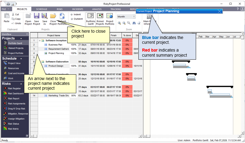 The current project is indicated by either a blue bar for project or red bar for summary project at the top of the RiskyProject workspace.