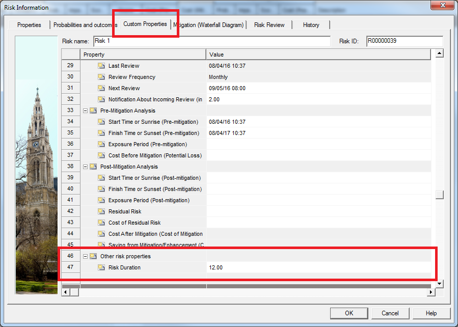 I current version of RiskyProject 6.1 you can define risk property in "Risk Properties" dialog. You can also associate the type of risk property and define maximum and minimum values if required. You cannot enter actual data for this risk property to the grid, but you can use "Custom property" tab in Risk Information dialog box (double click on risk ID in the risk register). It is important to note that custom risk properties are presented with this tab in the same order as in Risk Properties dialog. RiskyProject will validate risk property when you enter it. After you enter Risk Property in can be viewed with Risk Register. You can also use Filter to find risk with this risk property.