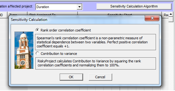 RiskyProject uses two algorithms to calculate sensitivity calculation: rank order correlation coefficient and contribution to variance. You can select either way to perform calculation. In most cases we use Spearman's rank correlation coefficient .